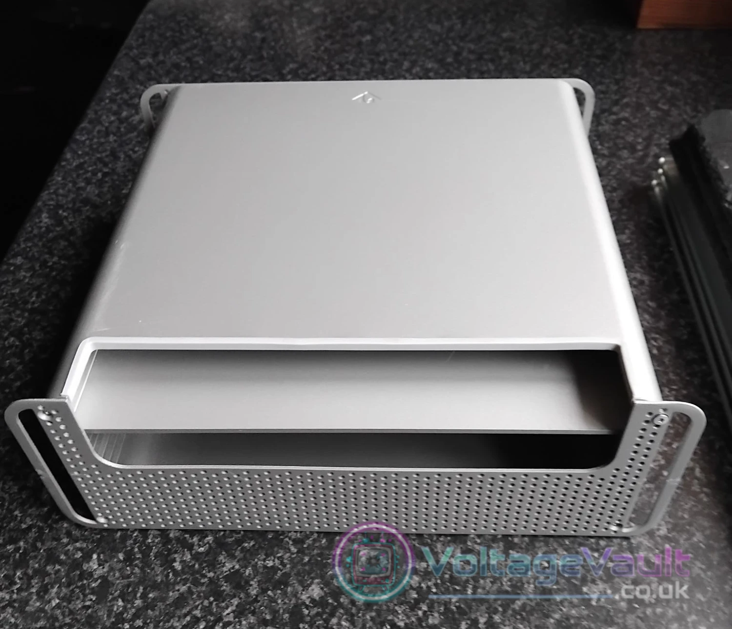 Hidden storage compartment inside for accessories like hard drives, cables, or hubs.